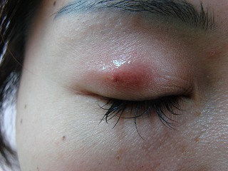 「陥没法」での失敗例 まぶたの真ん中辺りが、赤く腫れていますよね。 |